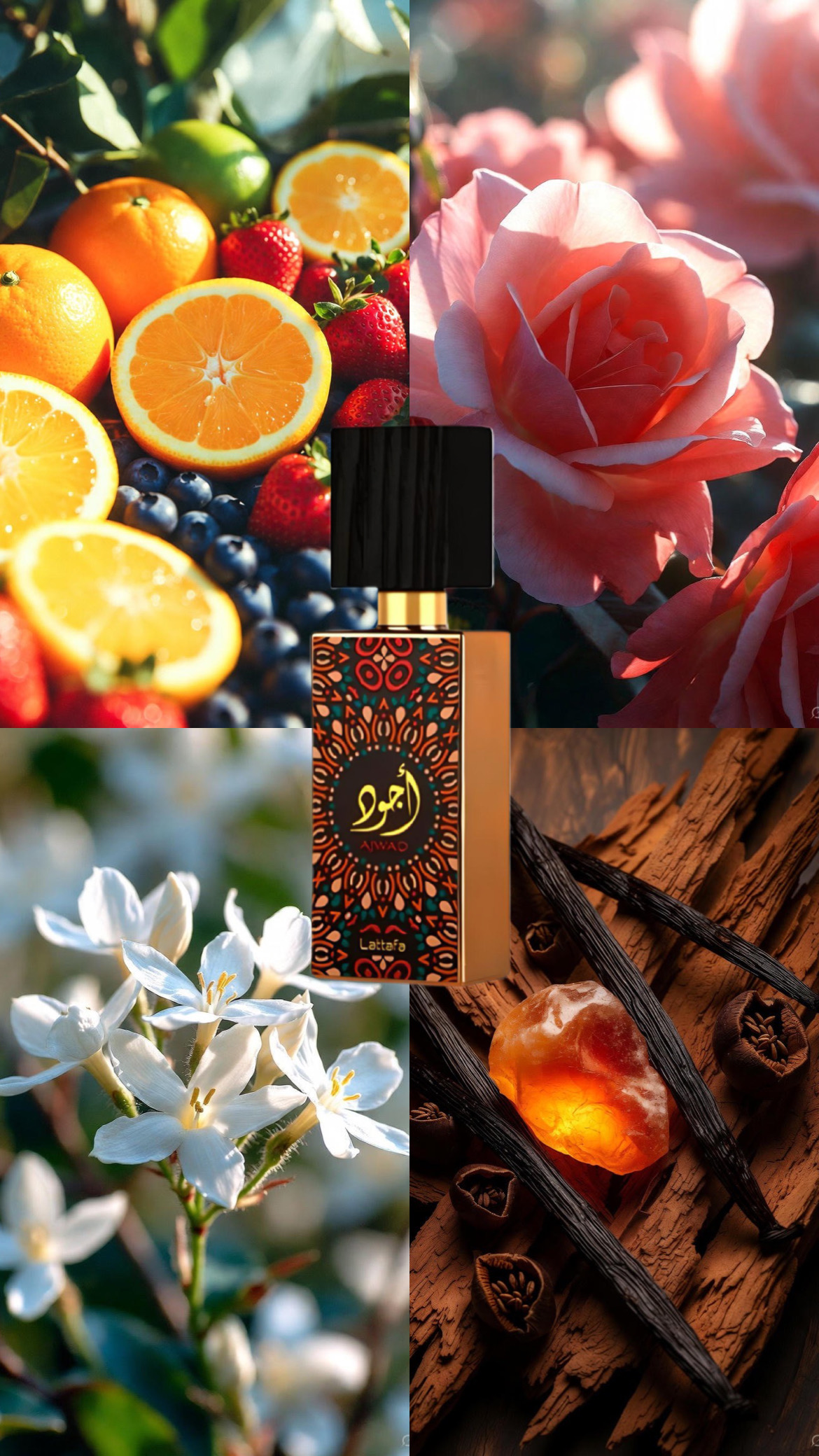 Kako se razvija na koži: Ajwad se začne s svežo, sadno – rahlo sladko noto; nato pride do cvetnega “srca” z vrtnico in jasminom, na koncu pa ostane topla, lesno-mošusna in rahlo vanilijeva baza, ki ustvarja čutno, mehko in udobno sled.