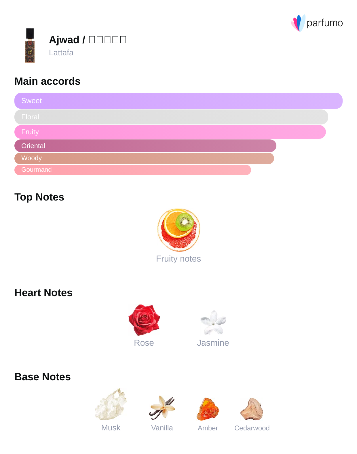Več uporabnikov in recenzij poudarja, da je Ajwad sladek, topel in eleganten parfum — pogosto s poudarkom na vaniliji, mošusu, roži in sadju.
