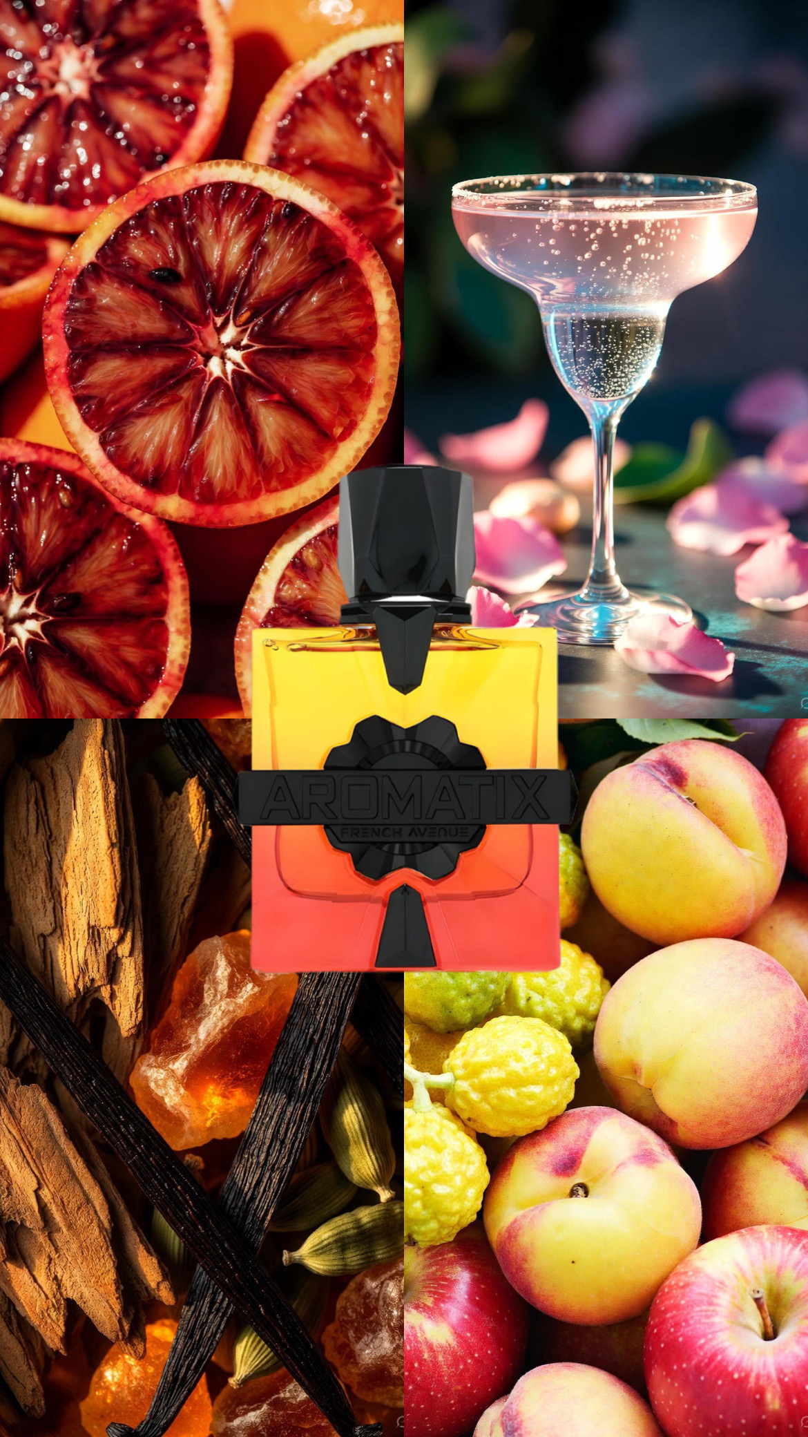 Torej: od svežega citrusno-začinjenega začetka → v sočno sadno sredico → končno v toplo-leseno/vanilijevo-ambre bazo.