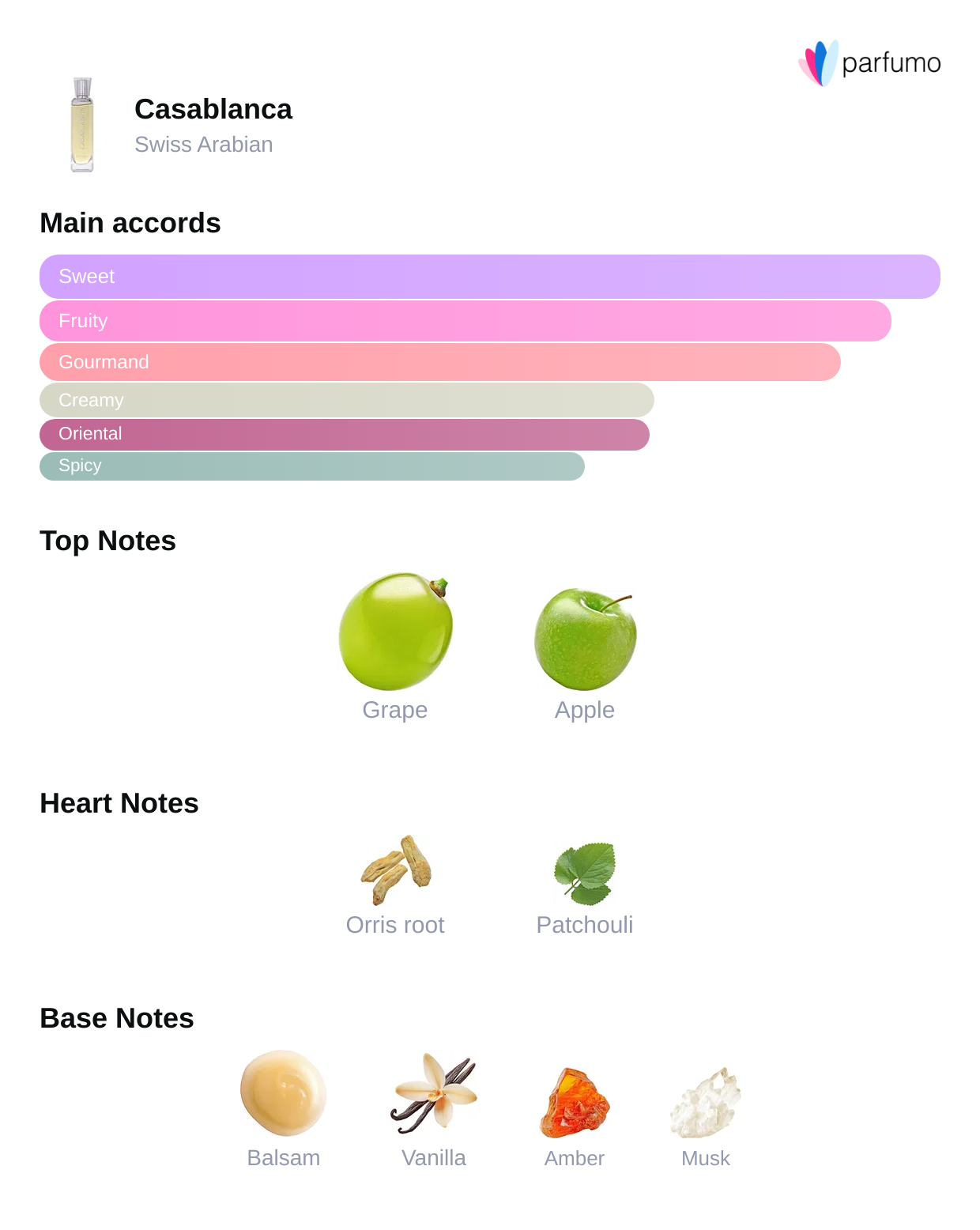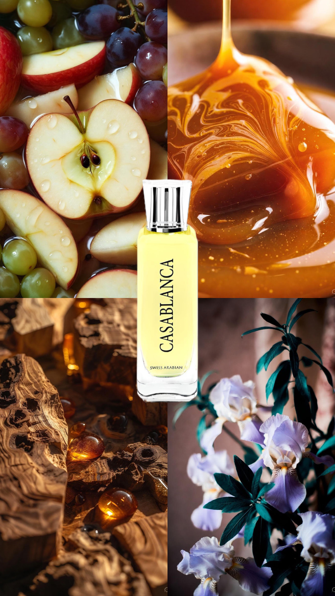 Tako Casablanca potuje od svežega in sadnega začetka → skozi lesno / zemeljsko sredico → v toplo, sladko‑usnjeno / ambro osnovo.