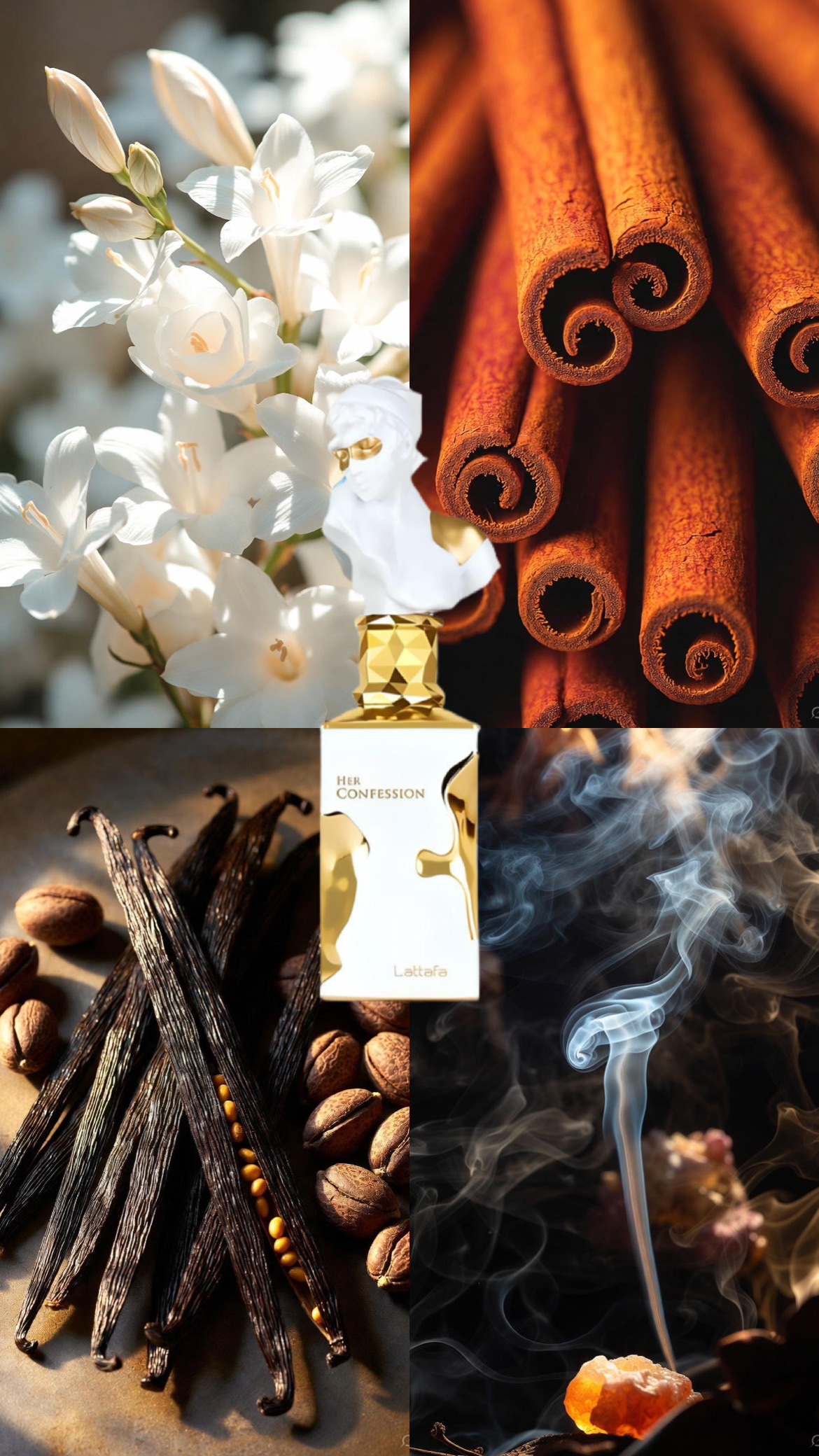 Vrhne note (opening): cimet + “Mystikal” (posebna molekula / kompleks), ki dajeta toplo, rahlo začinjeno in rahlo »mlečno / mistično« odprtje.
