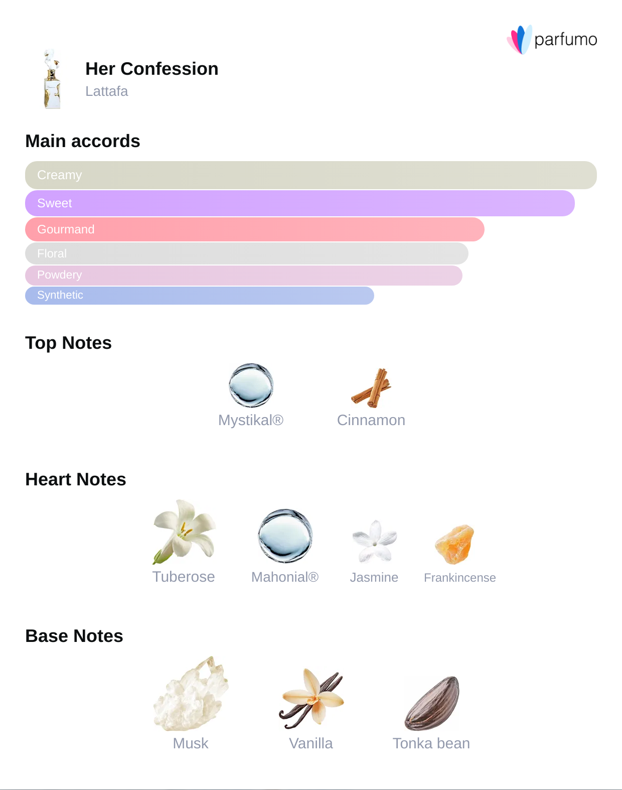 Her Confession je žensk (čeprav jo nekateri dojemajo tudi kot uniseks, če ti ustreza gurmansko-cvetna kombinacija), z izrazitim »toplim, kremnim, čutnim« karakterjem.