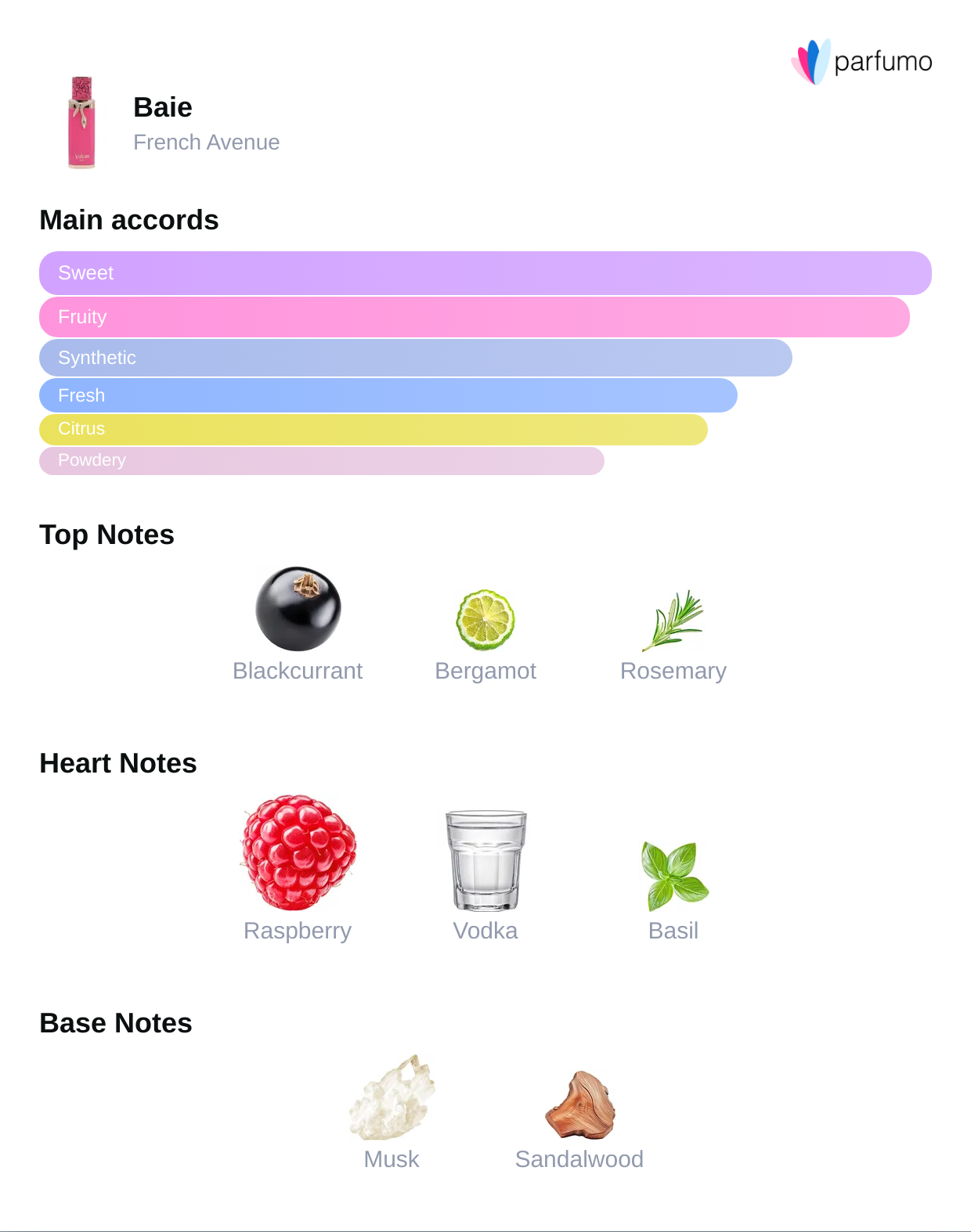 Malina (raspberry), vodka (vodična nota), šmarnica (lily of the valley) in bazilika.