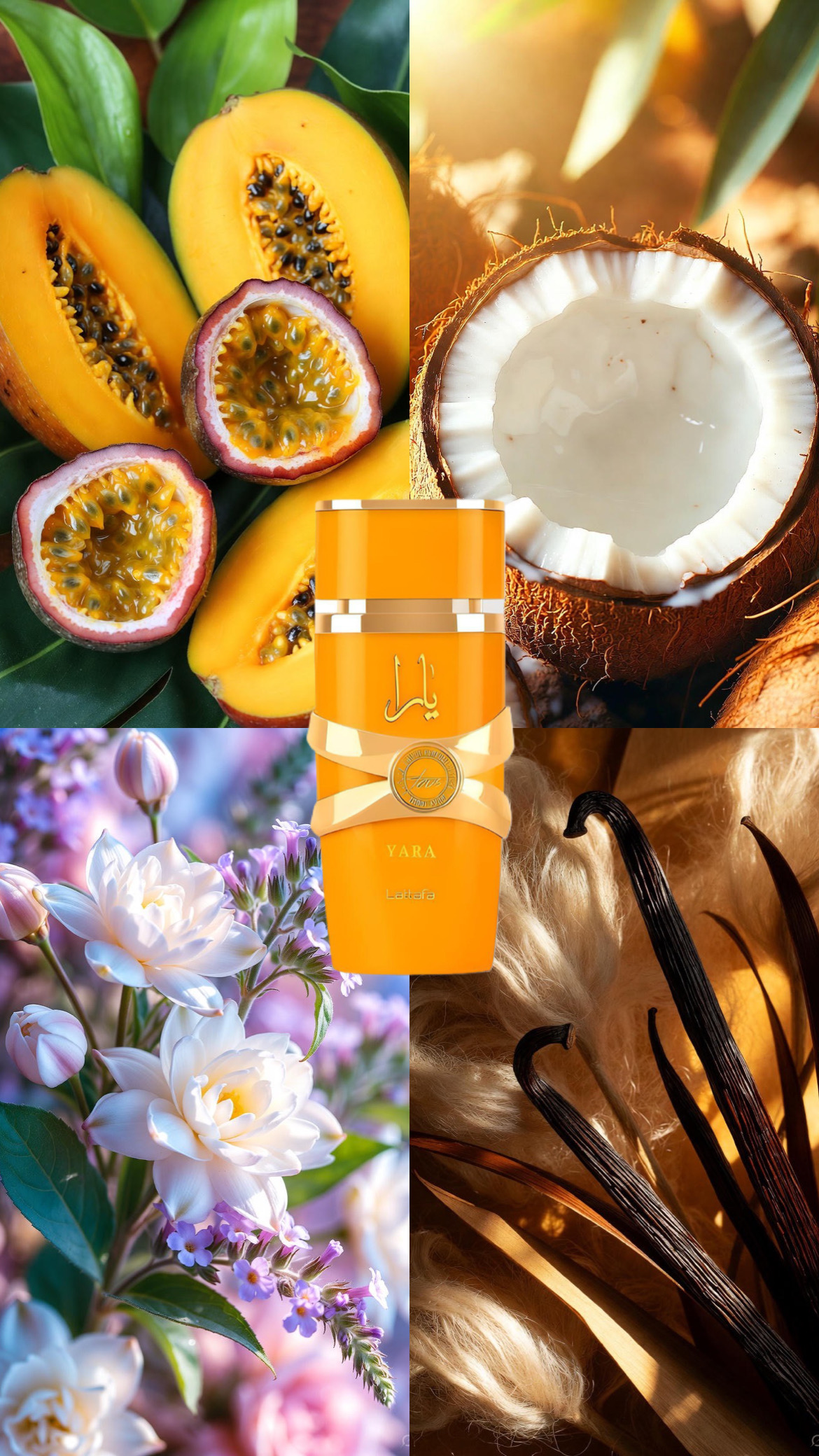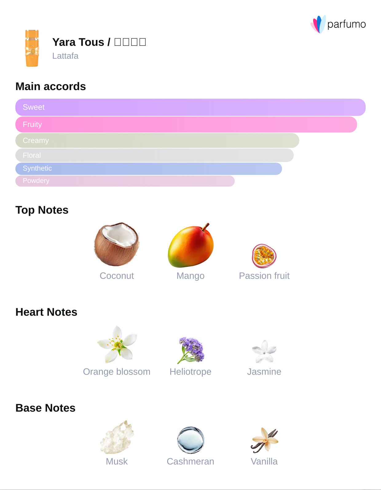 Yara Tous je ženska dišava, ki deluje tropsko, sadno-cvetno in kremasto-sladko. Je precej “lahka”, igriva in ženstvena — mešanica tropskih sadežev, cvetja in kremaste/vanilije-mošusne osnove.